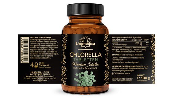 Eine Tagesdosis von 10 Tabletten liefert 3000 mg Chlorella.