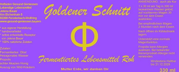 Das Goldene Schnitt Elixier ist ein roh belassenes, fermentiertes Getränk auf Basis fermentierten Obst-Wassers, Propolis, Akazienhonig und ausgewählter Wildkräuter. Die Rezeptur wurde von Jelena Bauer entwickelt und folgt einem handwerklichen Fermentationsansatz.