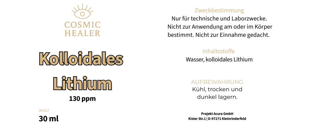 Kolloidales Lithium ist eine wässrige Lösung mit fein dispergierten Lithium-Partikeln in definierter Konzentration von 130 ppm (parts per million). Die Herstellung erfolgt unter kontrollierten Bedingungen, um eine möglichst gleichmäßige Partikelverteilung in reinem Wasser zu gewährleisten.