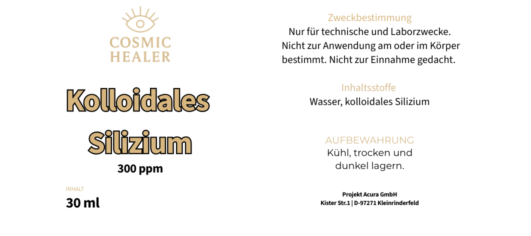 Kolloidales Silizium ist eine wässrige Lösung mit fein dispergierten Siliziumpartikeln in definierter Konzentration von 300 ppm (parts per million). Die Herstellung erfolgt unter kontrollierten Bedingungen zur Gewährleistung einer möglichst gleichmäßigen Partikelverteilung im gereinigten Wasser.
