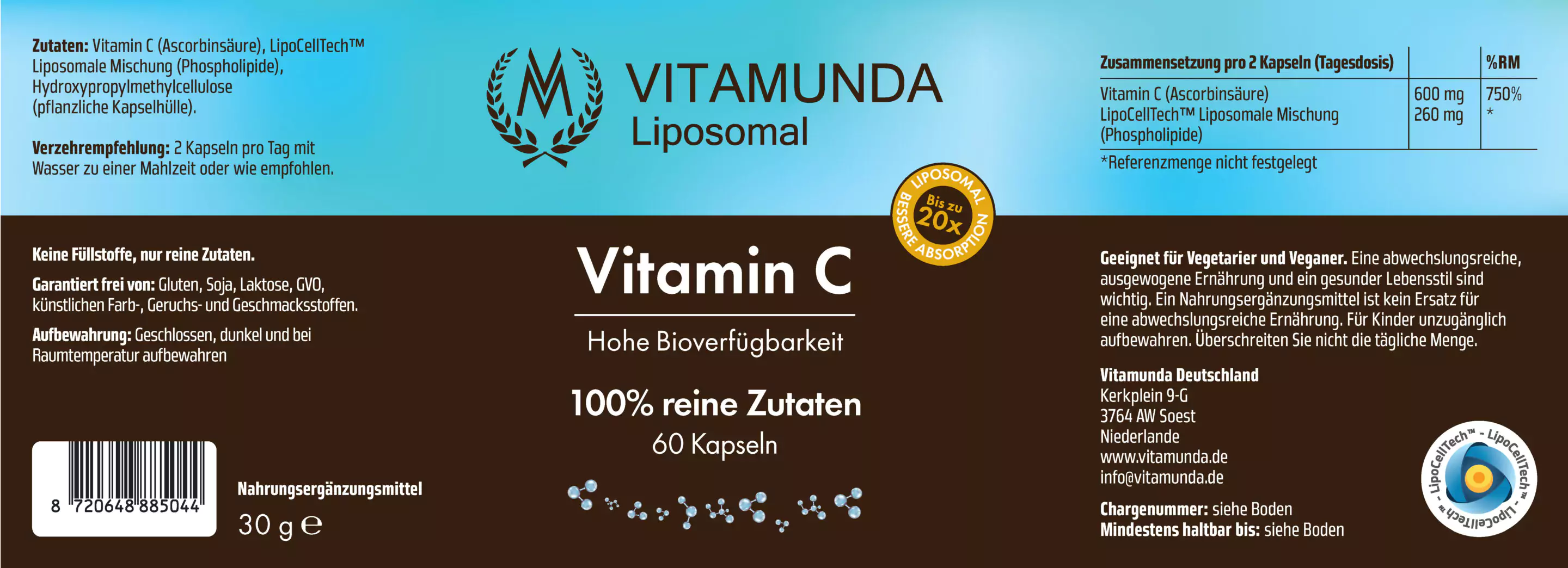Dieses Nahrungsergänzungsmittel liefert Vitamin C (Ascorbinsäure) in Kombination mit natürlichen, trockenen Liposomen nach der LipoCellTech™-Technologie. Die spezielle liposomale Verkapselung dient dem Schutz des Nährstoffs im Verdauungstrakt und unterstützt eine effiziente Aufnahme.