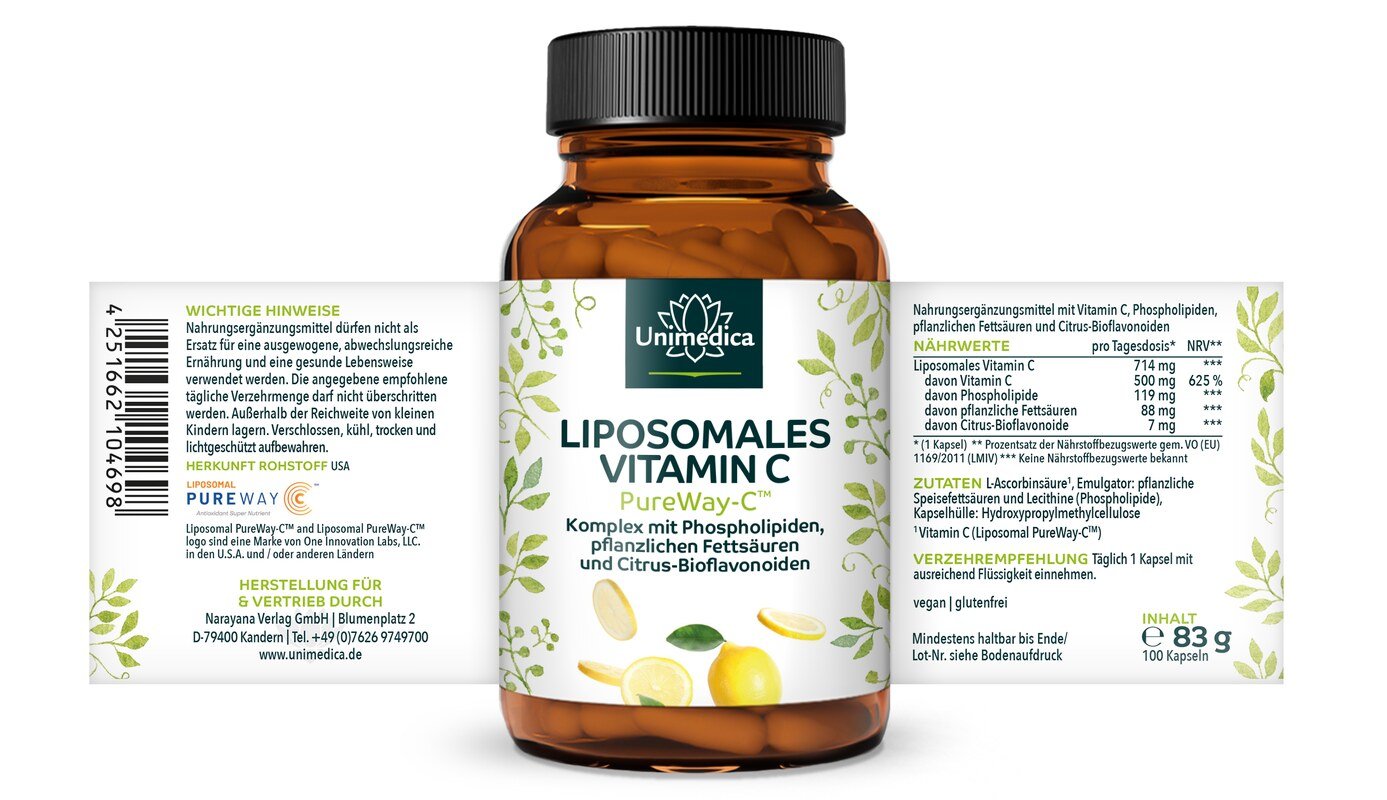Das enthaltene Vitamin C liegt in einer liposomalen Form vor. Liposomen bestehen aus Phospholipiden pflanzlichen Ursprungs, die Vitamin C umschließen.