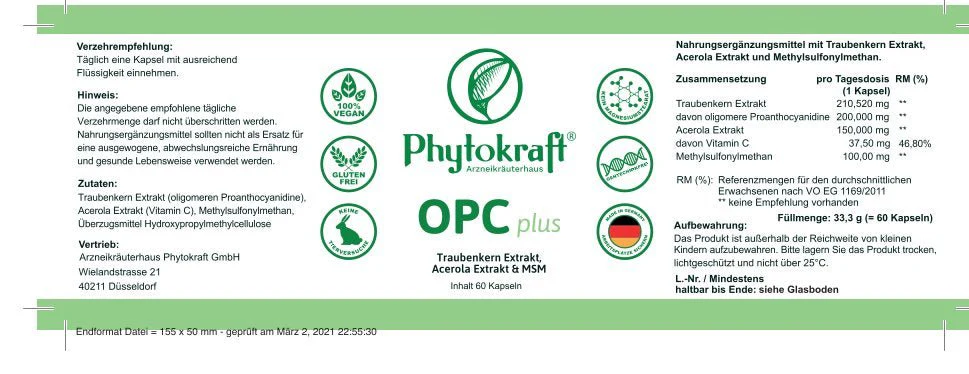 – davon OPC (oligomere Proanthocyanidine): 200 mgAcerola-Extrakt: 150,00 mg pro Kapsel