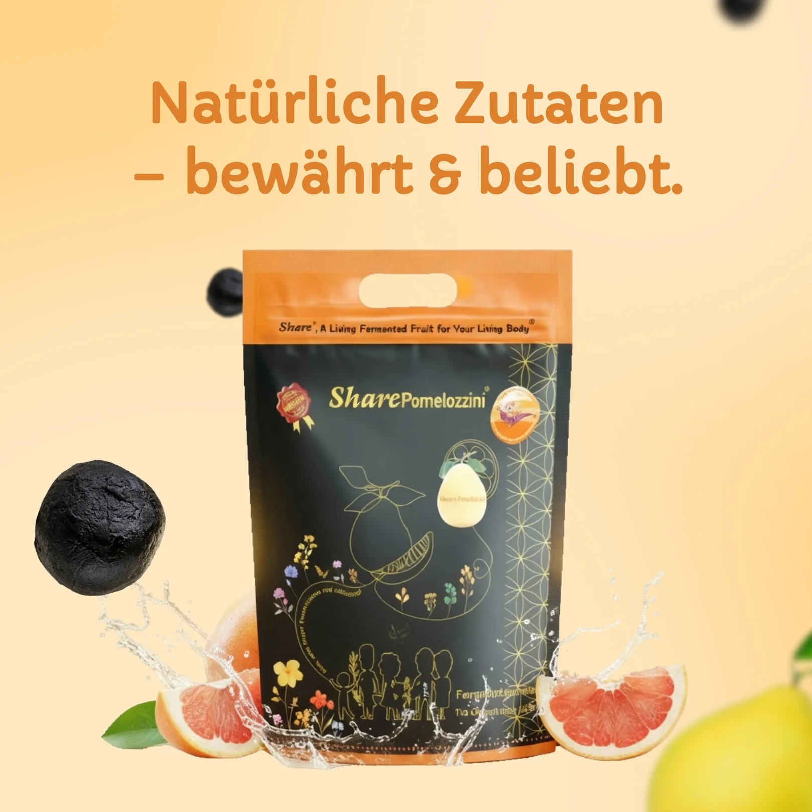 Für die Share Pomelozzini® werden reife Pomelos in einem aufwendigen Herstellungsprozess über viele Monate fermentiert. Während dieser Reifezeit entwickeln sich Aroma, Textur und Geschmack der Frucht auf natürliche Weise weiter. Das Ergebnis ist ein ausgewogenes, komplexes Geschmackserlebnis mit fruchtigen, leicht bitteren und angenehm säuerlichen Noten.
