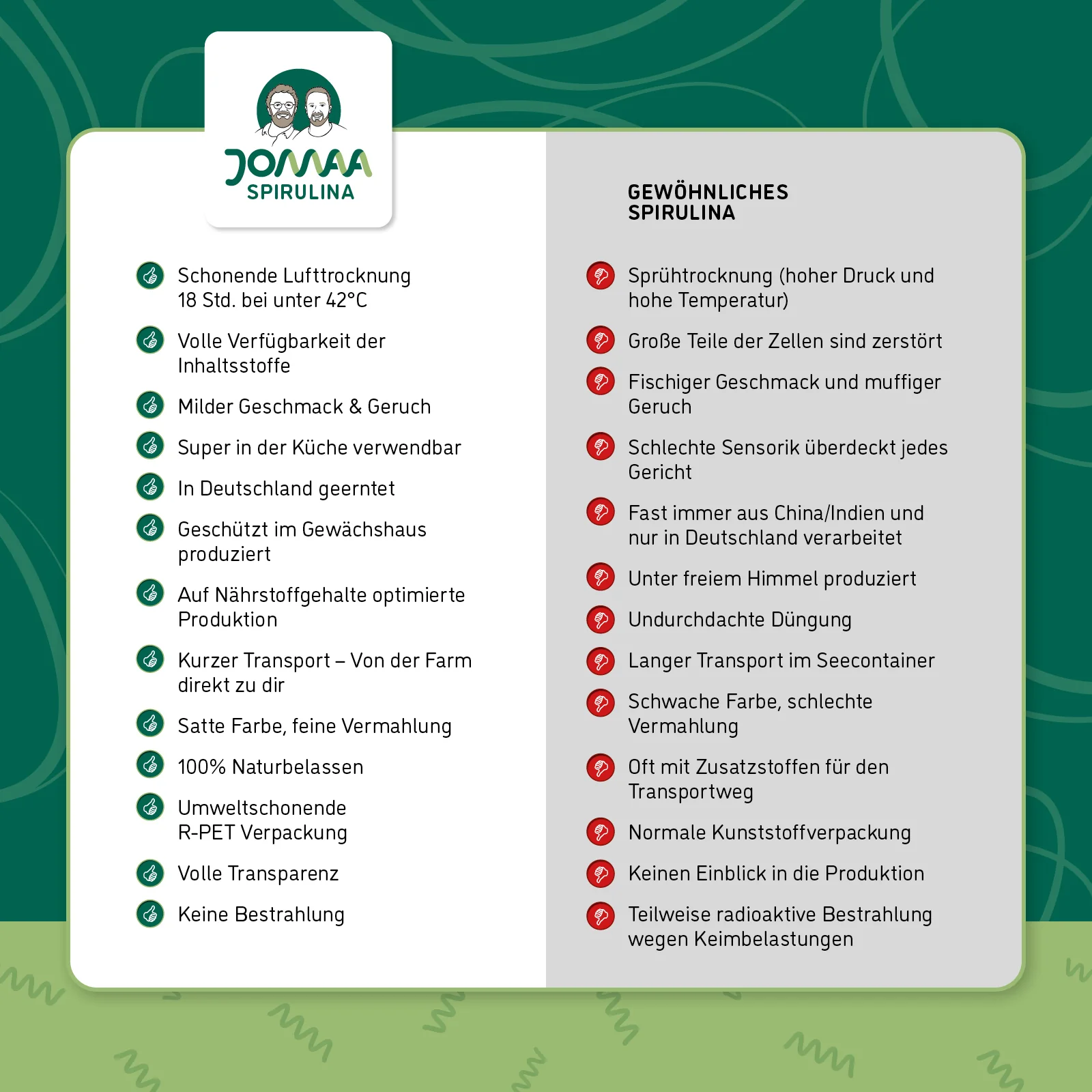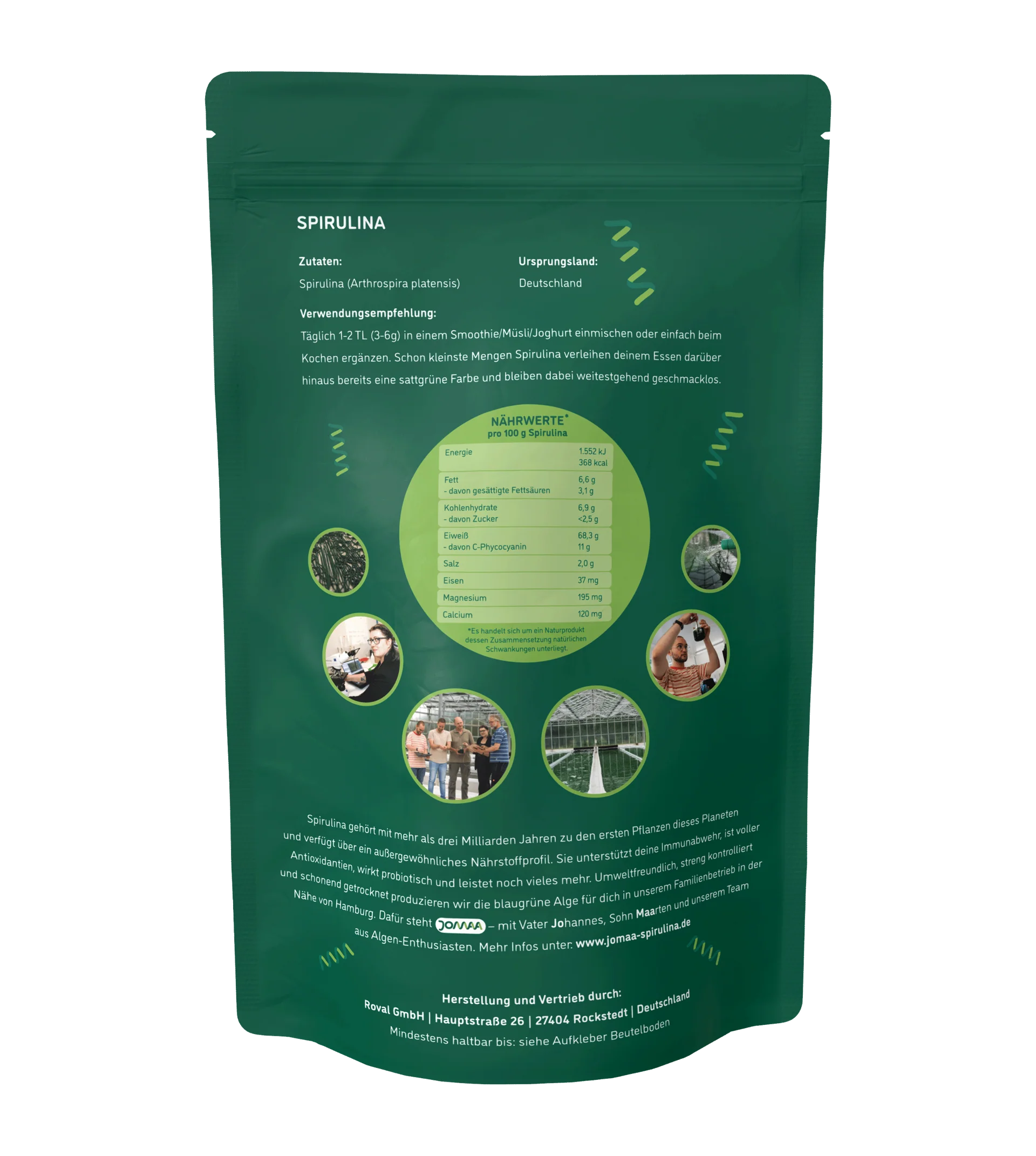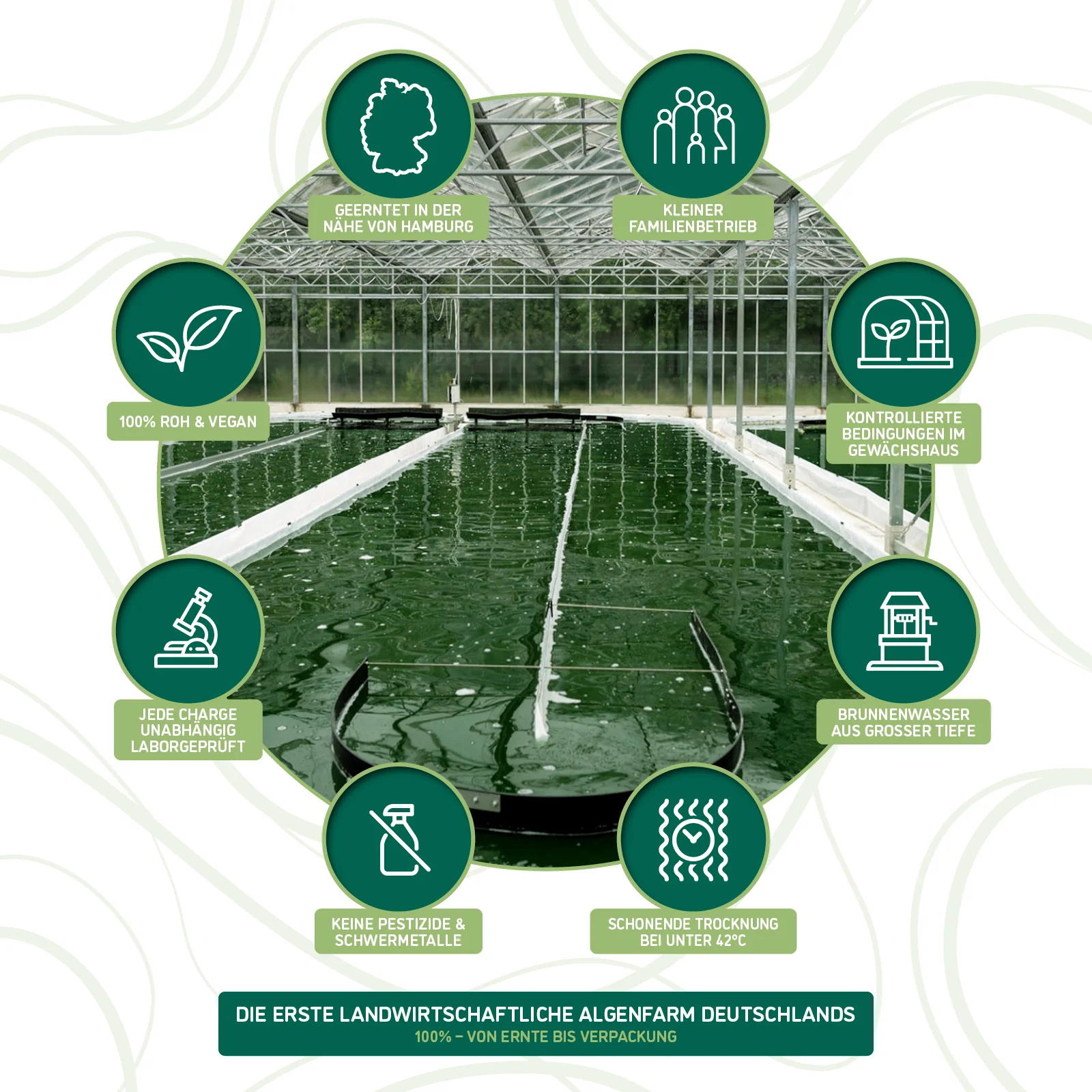 Die Spirulina wird kontrolliert auf betriebseigener Farm in Norddeutschland kultiviert. Nach der Ernte wird sie frisch verarbeitet und bei niedrigen Temperaturen in Rohkostqualität getrocknet. Diese schonende Verarbeitung dient dem Erhalt der natürlichen Produktmerkmale und der stofflichen Eigenschaften der Mikroalge.